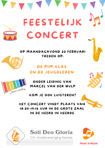 Op maandagavond 23 februari treden de PIM-klas en de jeugdleden van Soli Deo Gloria op onder leiding van Marcel van der Wulp.