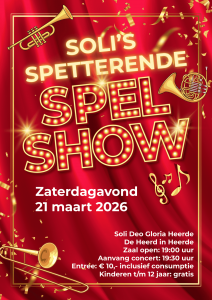 Op zaterdagavond 21 maart staat het jaarlijkse voorjaarsconcert van Soli Deo Gloria Heerde op de planning met dit jaar als titel: Soli’s spetterende spelshow. Tijdens deze avond zal de hele vereniging van zich laten horen. Het concert heeft een speels karakter, waarbij het publiek actief betrokken wordt bij de avond. Het programma? Dat bepaalt u zelf! Om dat mogelijk te maken, zijn er maar liefst 25 muziekstukken geselecteerd. Een flinke klus, want al deze werken moeten natuurlijk ook ingestudeerd worden. Dat vraagt veel van het orkest, maar het belooft daardoor ook een bijzonder afwisselend en verrassend programma te worden.